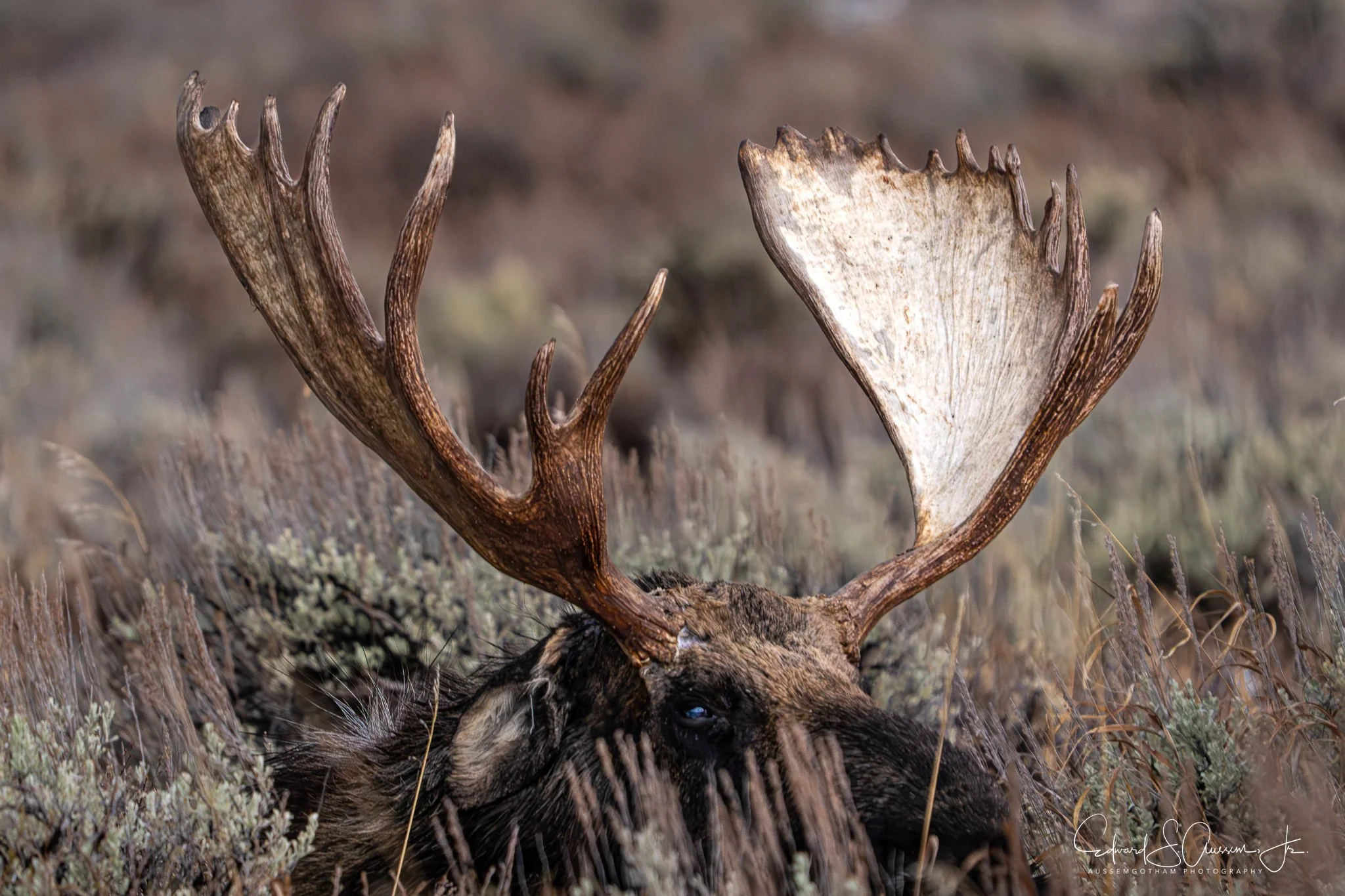 These enormous animals sport unique, photogenic antlers called "paddles." After grazing for hours, they settle down to rest. In this sitting position, photographing just their paddles rising above the sagebrush creates an attractive and unusual composition, especially with favorable light and background.