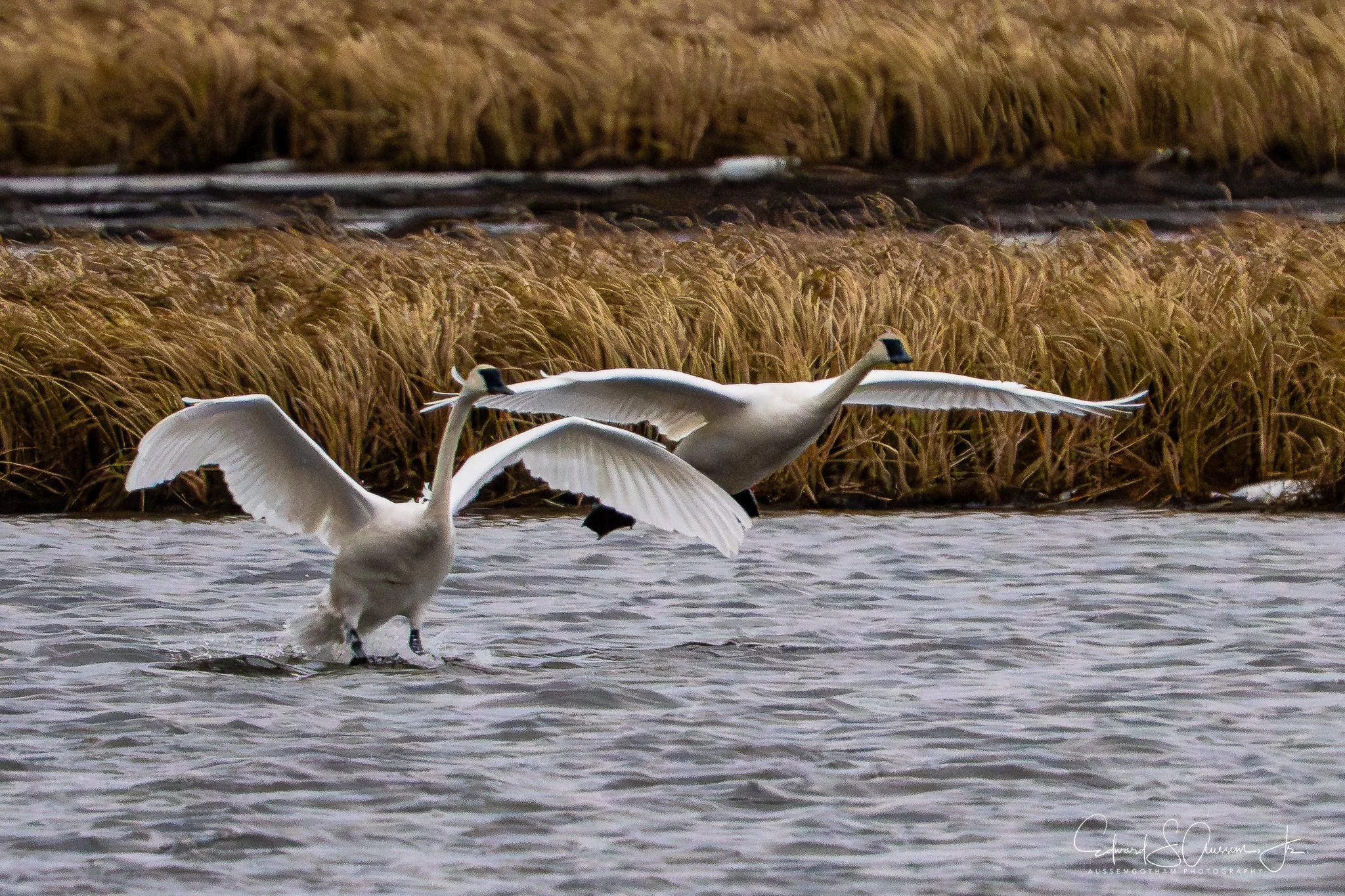 We found numerous trumpeter swans on a pond, though capturing interesting poses proved challenging. I was fortunate to photograph them preening and a pair landing on the water. A tripod became essential for supporting the long, heavy lens during extended shooting sessions. We took many photographs, knowing only a select few would make the final cut.